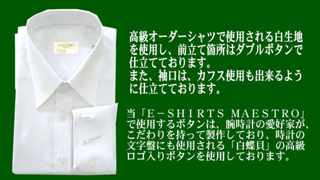 今回のリターン品としまして、E-SHIRTS「MAESTRO」のシングル衿の白生地のタイプをご用意させて戴きました。デザインは今後のオーダーメイド展開に先駆けてシンプルなバージョンのシャツでご用意させて戴きました。シンプルではありますが、生地は「国産」、ボタンは高級時計の文字盤にも使用されている「白蝶貝」を使用するなど細部にも拘ったお勧め出来る1着です!