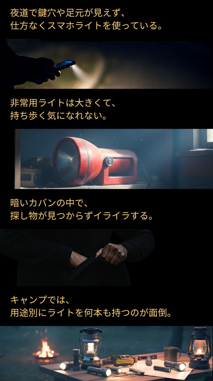 - ポケットに入れても気にならない。 必要なときにはしっかり明るい。 日常に、さりげない安心を