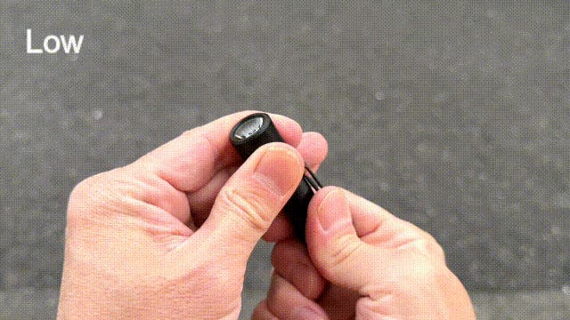 軽く回すと点灯し、いったん戻してからもう一度回すとモードが切り替わります。