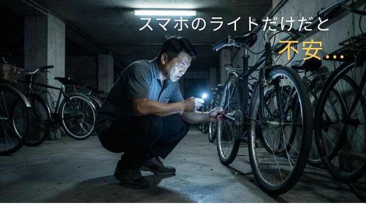 暗い駐輪場で、スマホのライトを頼りに鍵を探す。