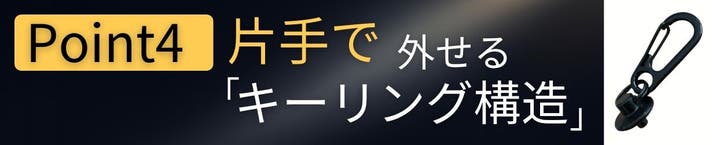 A 金属製カラビナと本体をしっかり固定する構造で設計しており、通常の使用で外れてしまう心配はほとんどありませんので気兼ねなく使用ください。