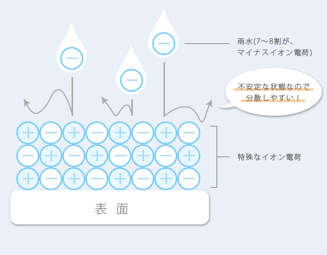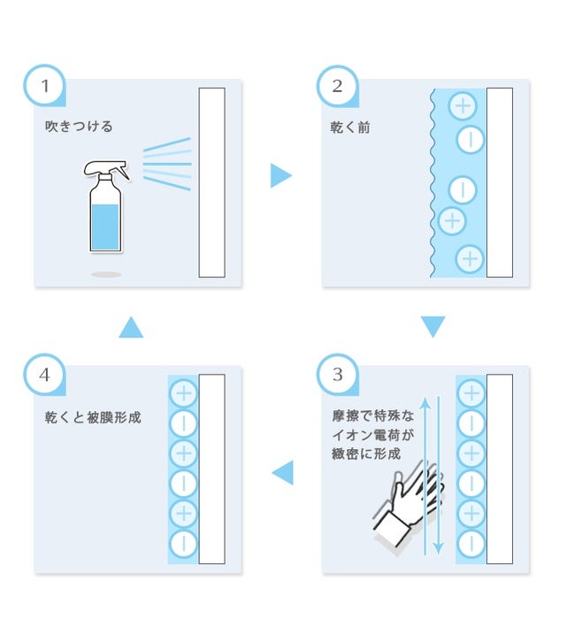微弱荷電化処理という独自の技術により、対象物に吹き付け布拭きやブラッシングすることによる摩擦で、素材表面に+プラスと-マイナスのイオン電荷が規則正しく緻密に並んだ特殊なイオン電荷層を形成。