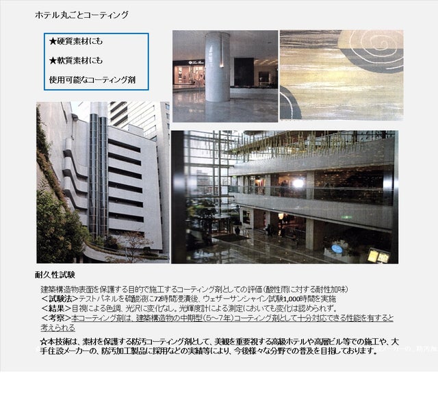 建築構造物表面を保護するコーティング剤として専門機関で行った耐久性試験では、建築構造物の中期型(5~7年)コーティング剤として十分対応できるとの評価も出ており、長期間効果が持続することが確認されております。