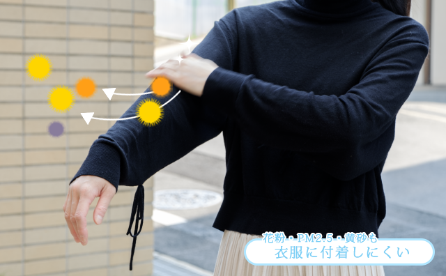 緻密に配列した特殊なイオン電荷(+-+-+-)の分散と反発、または吸着により、花粉や黄砂、ホコリや超微細なPM2.5のような付着物質が簡単に払いのぞけ、繊維内への侵入も抑制。