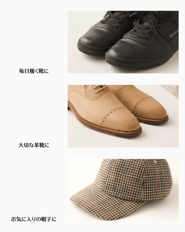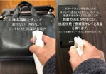 ※ヌメ革やバックスキンなどのような水シミする皮革に直接スプレーすると、革が部分的に変色(水シミと同様の現象)する可能性があります。水を含ませ硬く絞ったタオルなどにたっぷりスプレーし、目立たない箇所で確かめた後、問題なければ全体に塗り広げてください。