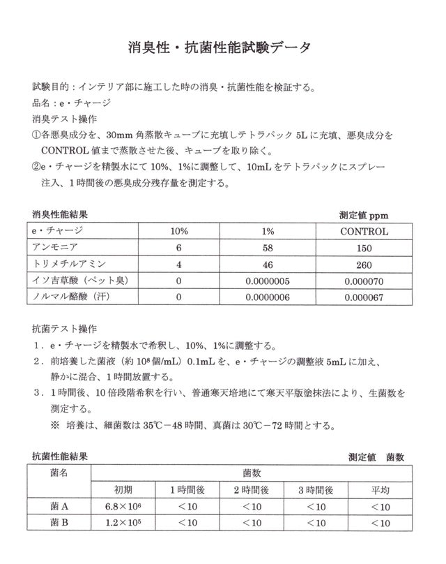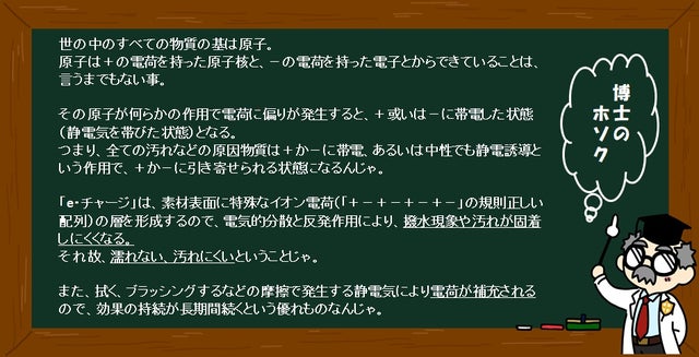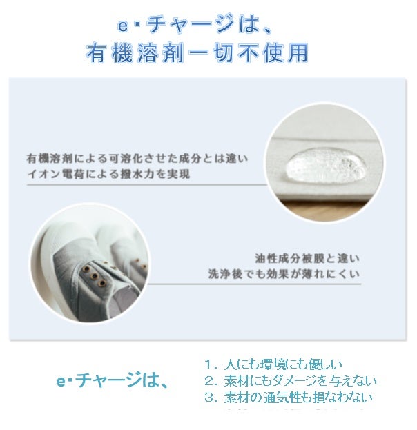 e・チャージ は、独自の微弱荷電化技術により、これまでのイオン化水をさらにパワーアップさせ、均一なイオン配列を従来よりも細かく密にすることで、有機溶剤を一切使用せず、撥水・防汚機能を高め、さらに付加機能として抗菌性、消臭性を発揮します。
