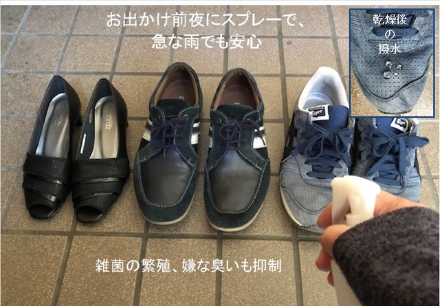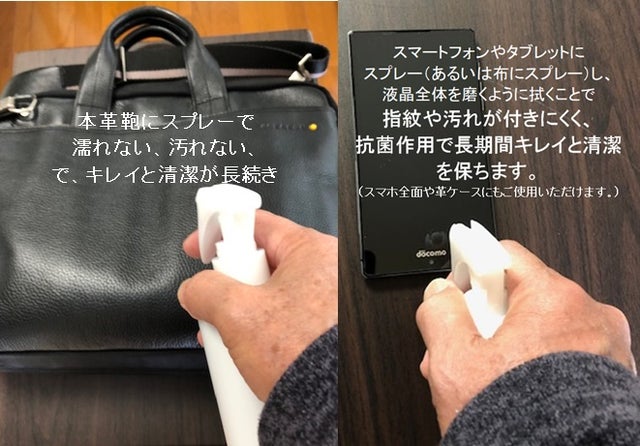 地球温暖化や健康被害の原因の一つとして懸念されている有機溶剤(VOC)やフッ素を一切使用せずスプレーするだけで、或いはスプレーした後に擦ることで、撥水・防汚・抗菌・消臭効果を発揮します。
