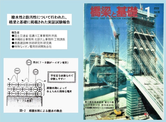 ●特殊なイオン電荷による超撥水剤;ケーブル表面に特殊なイオン電荷を与えることによって、雨滴がケーブル表面に付着しようとしても電荷的に不安定な状態となり、分散しやすくする(=撥水効果を発揮する)ことを目的とし開発されたものである。その特性について、ケーブル表面に塗布することで撥水性を大幅に高めることができることを室内試験と電子顕微鏡写真により明らかにした。また、現地においても水滴が分散する様子を確認した。