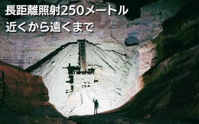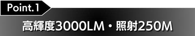 高輝度3000ルーメン、輝度15577カンデラ、照射距離250メートルで近くから遠くまで昼間のように明るく。
