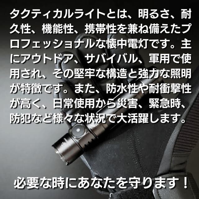 他に類を見ない超高性能タクティカルライト、3000ルーメンの眩しいほどの明るさで高性能で頑丈でコンパクト、またカッコいいデザインで一目見て気に入りました。