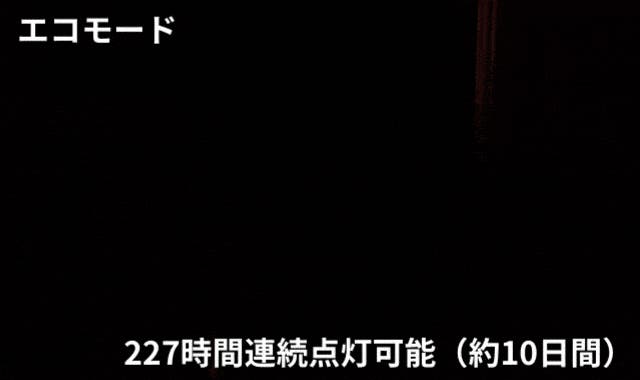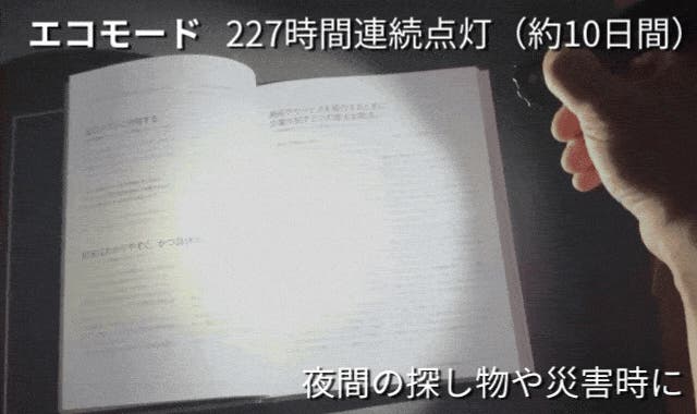 エコモード時は一回の充電で約227時間連続点灯可能、日に換算すると約10日。10ルーメンの十分すぎる明るさで倉庫の探し物や災害時の非常灯、日常使いなどに大変便利です。