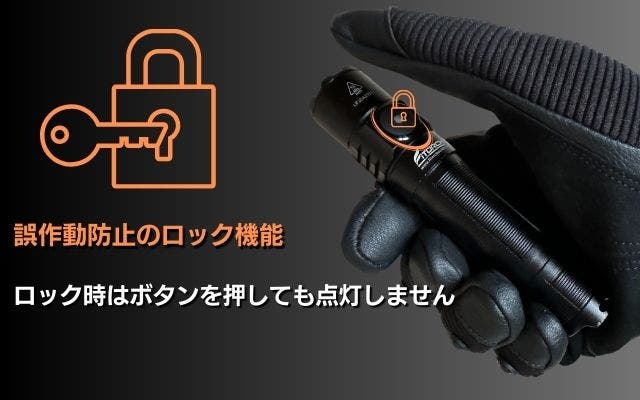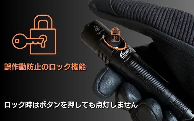 ロック機能を使えばポケットやバックの中に入れて持ち運ぶ時の誤作動や、小さいお子様が触っても点灯しません。