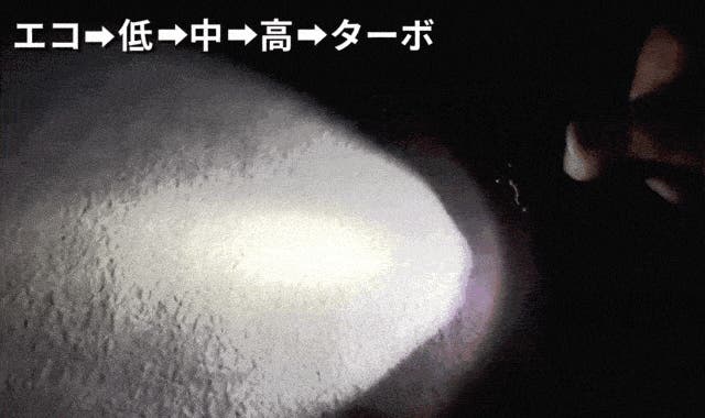 使用時間:ターボ:2.6時間・高モード:5.25時間 ・中モード:14.2時間 ・低モード:29時間・エコモード:227時間