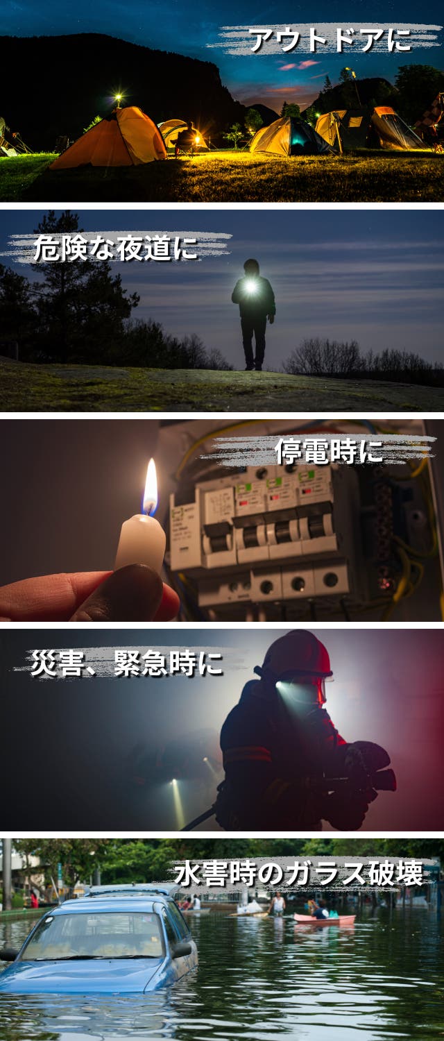 キャンプ・アウトドア・災害時・緊急時・防犯・夜の散歩・ペットの散歩・夜間の作業など日常のあらゆる場面で活躍します。