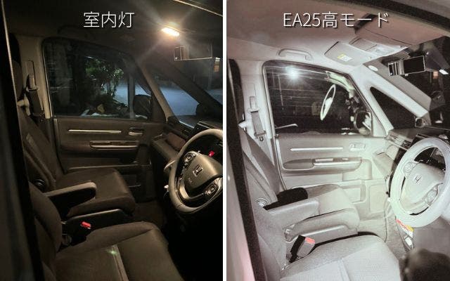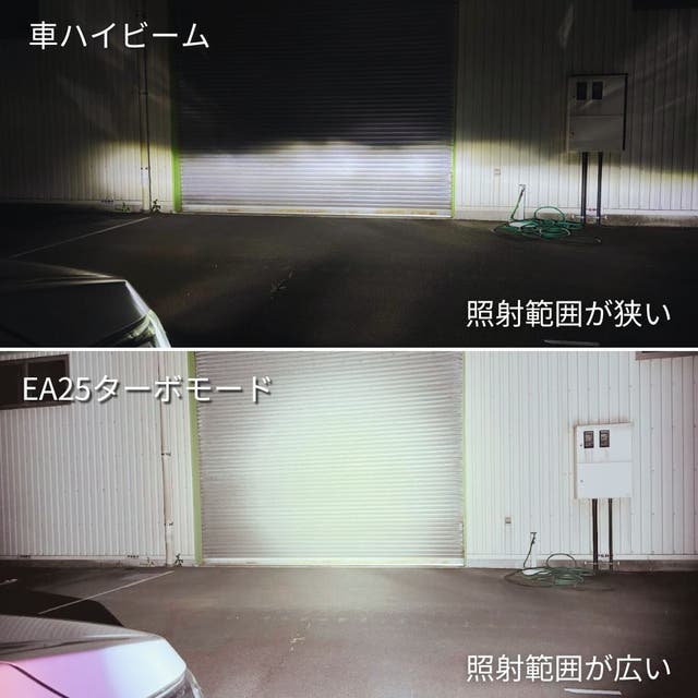EA25は車のハイビームと比べても広角で照射範囲が広く、照射距離も250メートルで近くから遠くまで明るく照らすことが出来ます。