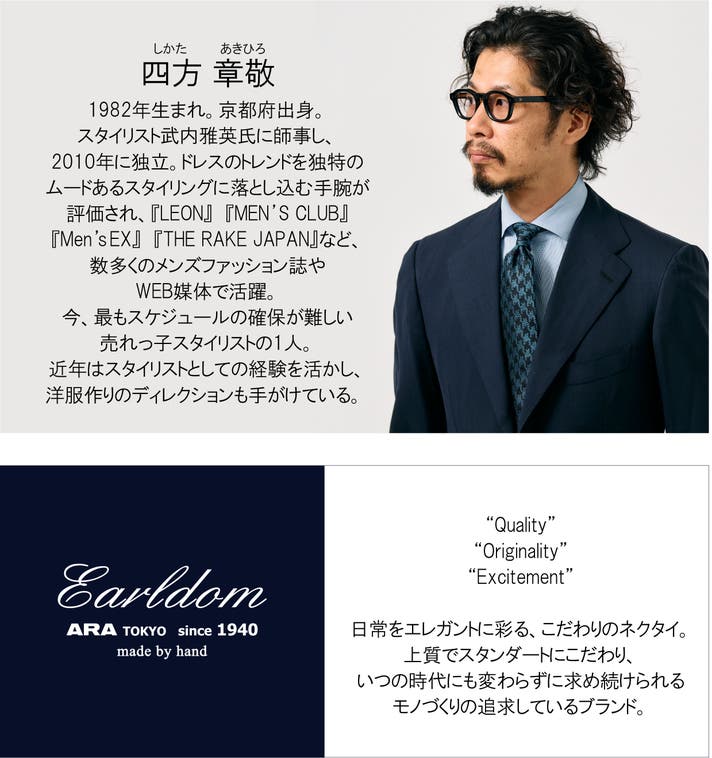 「ヴィンテージモダンな桐生織ネクタイ」、「シルクスフレマフラー」、「シルクネッカチーフ」に続く、Earldom(アールダム)×四方章敬コレクションの第4弾!