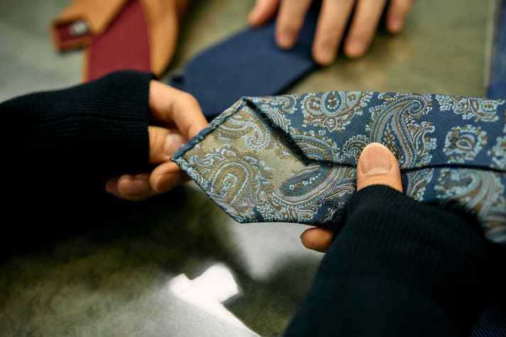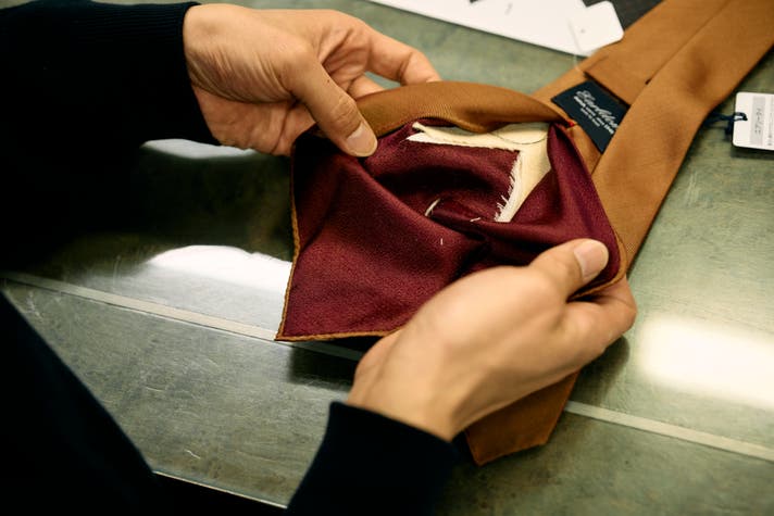 なお折り返したネクタイ生地が重なる部分を開くと、ループ状に糸が飛び出ていることがわかるでしょう。これは「たるみ糸」と呼ばれるもの。高級なハンドメイドタイは1本の縫い糸で生地を縫製しており、あえてその糸を余らせているのです。こうすることでタイを締めたり緩めたりしたときに糸が動き、縫い糸や生地の破損を防ぐのです。縫製部分が緩んだ場合も、このたるみ糸を軽く引っ張りことで元に戻ります。
