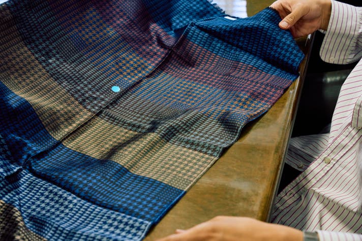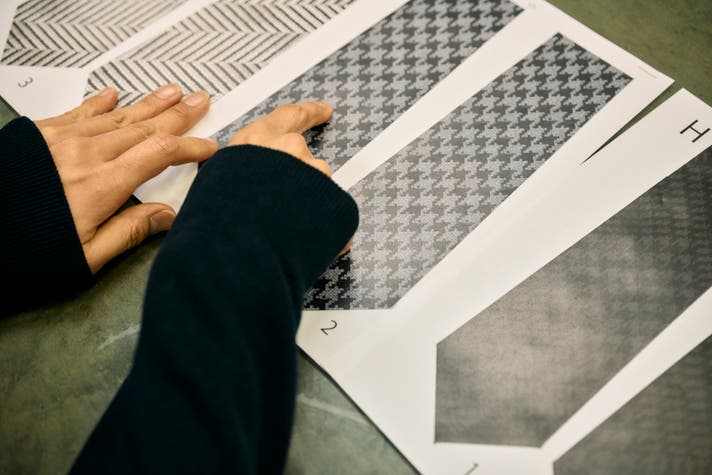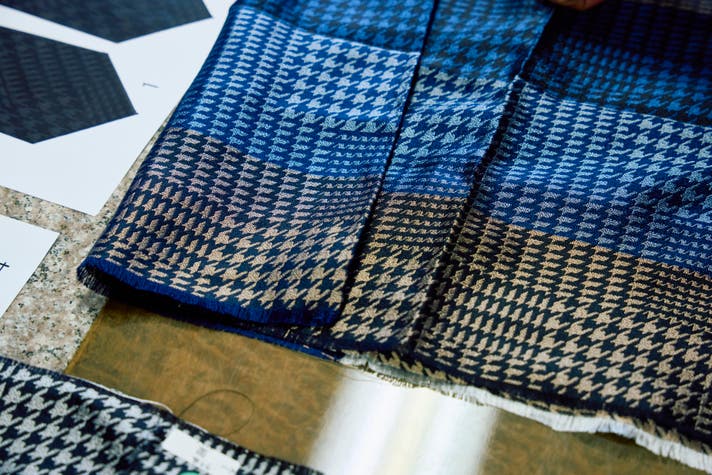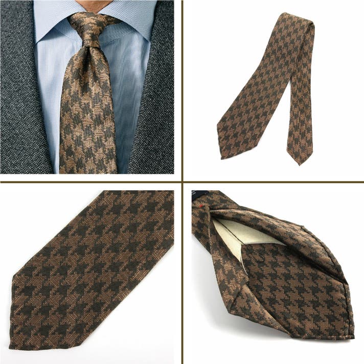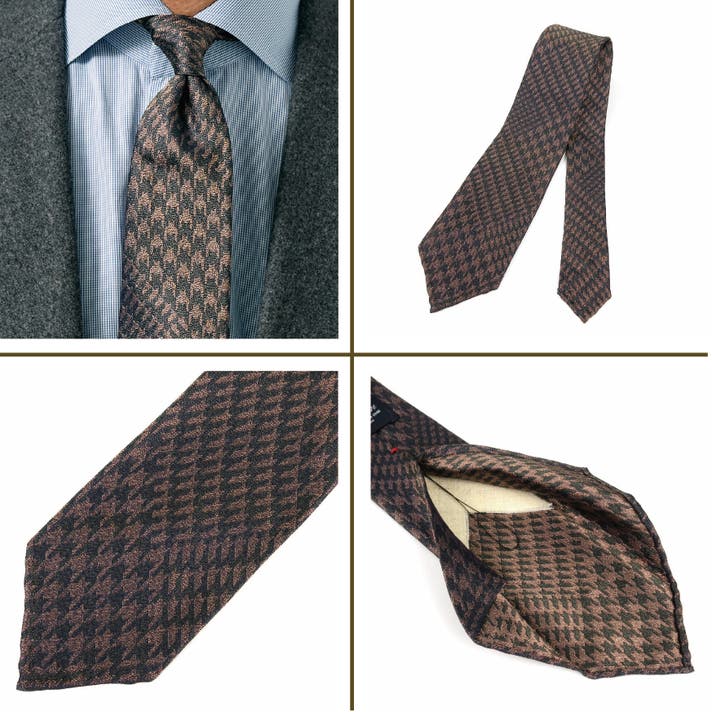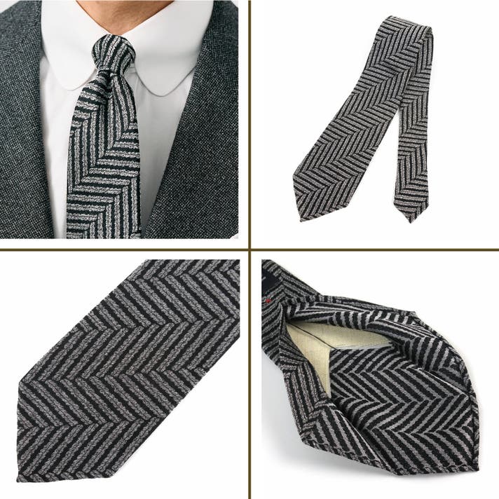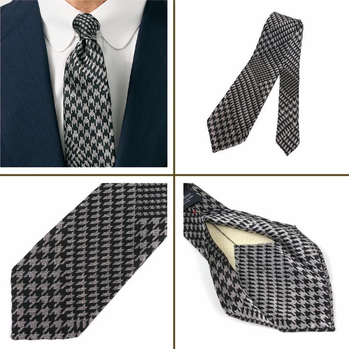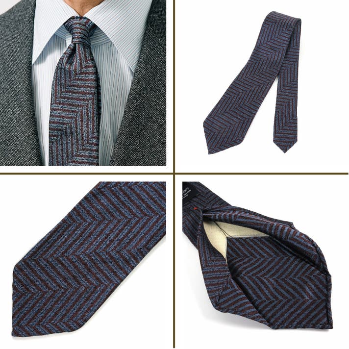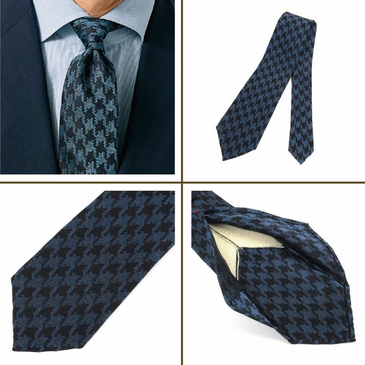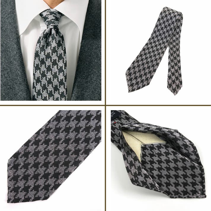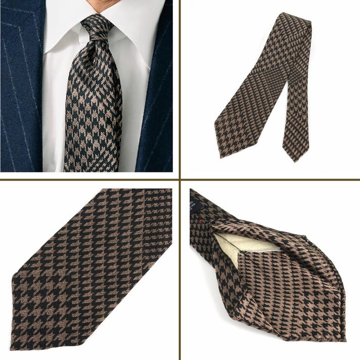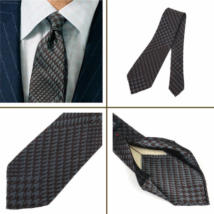 「あまりお洒落すぎる柄だと、着用者を選んでしまう。だからスーツやジャケットで皆さん馴染みの柄を使用することにしたのです。この手の柄をネクタイに採用する場合、柄のパターンを小さくすることが多いものですが、それだとスーツやジャケットの柄と喧嘩してしまうことも。だから今回はひとつひとつの柄をぐっと大きくすることにしました。結果モダンな雰囲気のデザインになりました」(四方さん)