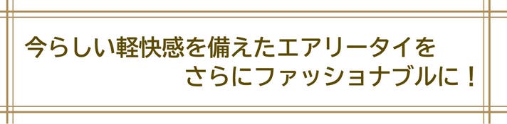 オフィスカジュアルの浸透でノータイの気楽さに慣れてしまったけれど、最近再びネクタイのオシャレを積極的に楽しみたいというマインドになっている方も多いのではないでしょうか。軽く締められるのに、さりげなく非凡なセンスをアピールできる「四方章敬プロデュースのエアリータイ」は、そんな方々にとっても最善の選択になると自負しています。