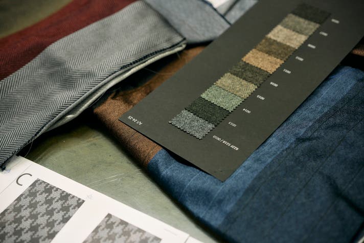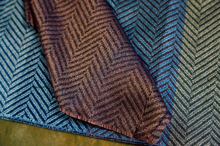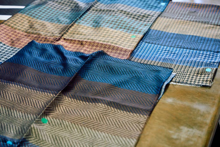 配色は皆さんお手持ちのベーシックなスーツに合わせすいよう、ネイビー、グレー、ブラウンを基調に検討。サンプルカラーを何度も制作しながら、四方氏とアールダム制作チーム、そして現場の職人たちとの間で協議を重ね、最終的には「ビッグヘリンボーン」と「ビッググレンチェック」はそれぞれ4色、「ビッグハウンドトゥース」は3色のバリエーションをご用意しました。配色の妙、そしてなるべく光沢が控えめな色糸を用いたことで、いずれも最近のニュアンスカラーのトレンドともマッチする、派手さ控えめの柔らかなカラートーンに仕上がっており、誰もが簡単に胸元を旬に彩ることができるでしょう。