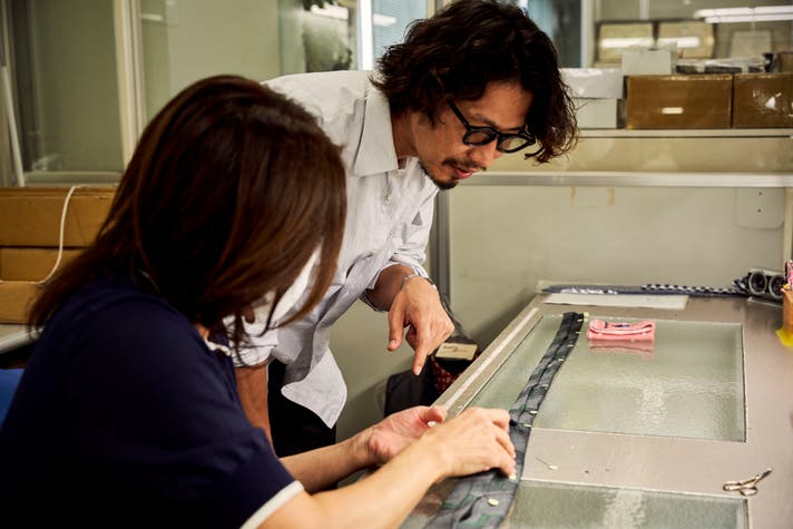 アールダムの「エアリータイ」をチェックする四方さん。「軽いけれど、生地感自体はしっかりしていて、仕立ても本格的なんですね」(四方さん)