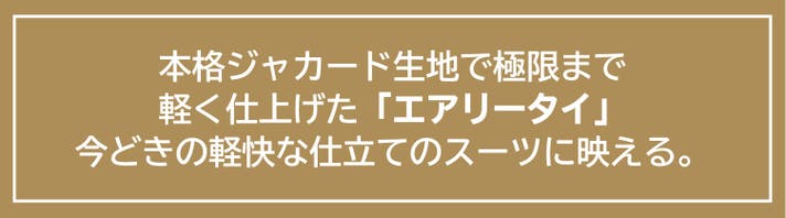最近のスーツやジャケットは、薄い心地を用い、パッドなども極力省いた軽快な仕立てが主流。そこに昔ながらの重厚なシルクのネクタイを締めると、どこかチグハグな印象となることが多いものです。そこでアラ商事が5年前に開発したのが「エアリータイ」です。旗艦ブランドの「Earldom(アールダム)」で展開し、すでに多くの方々からご支持をいただいております。