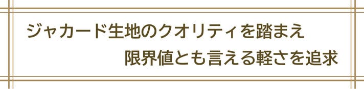 「ジャカードタイを軽く仕上げるのはとても難しいのですが、アラ商事はもともと極上のシルクジャカードタイで発展してきたメーカー。織り方や使用するシルク糸の選定、フィニッシングの工程などにとことんこだわっていただき、今回、驚くほど軽いジャカード生地が完成しました。クラシックなスーツにも映える重厚な見た目なのに、着用すると抜群に軽い。そんなギャップを楽しんでいただけたらと思います」(四方さん)