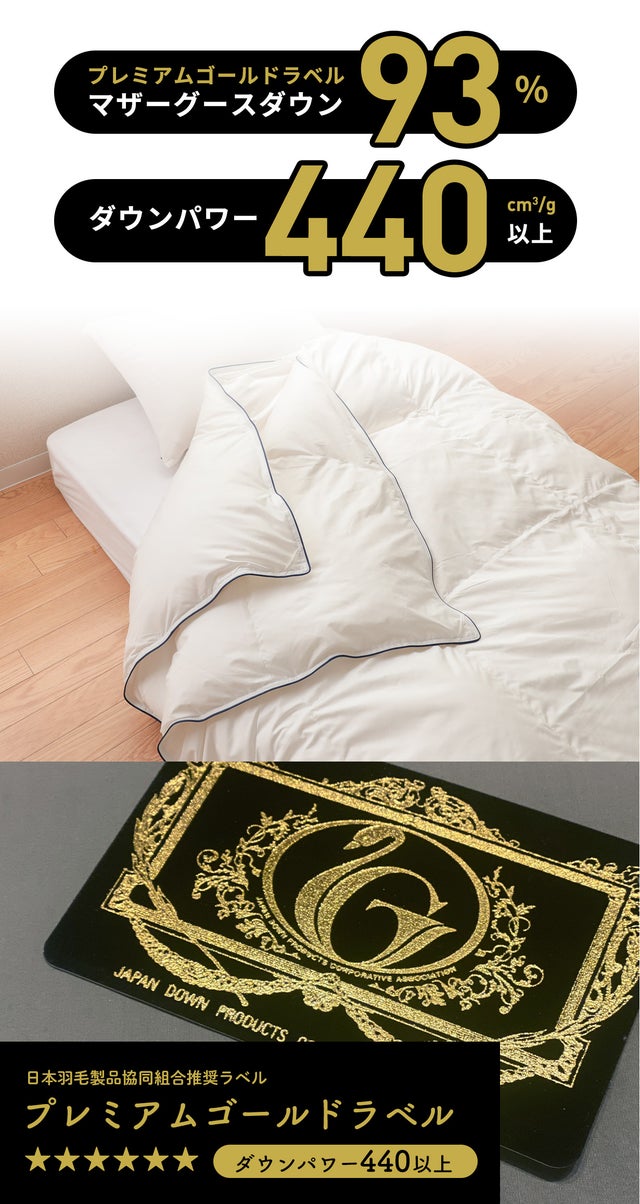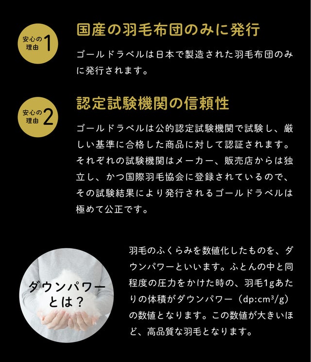 最上級のプレミアムゴールドはダウンパワー440cm3/g以上であることを証明しています。