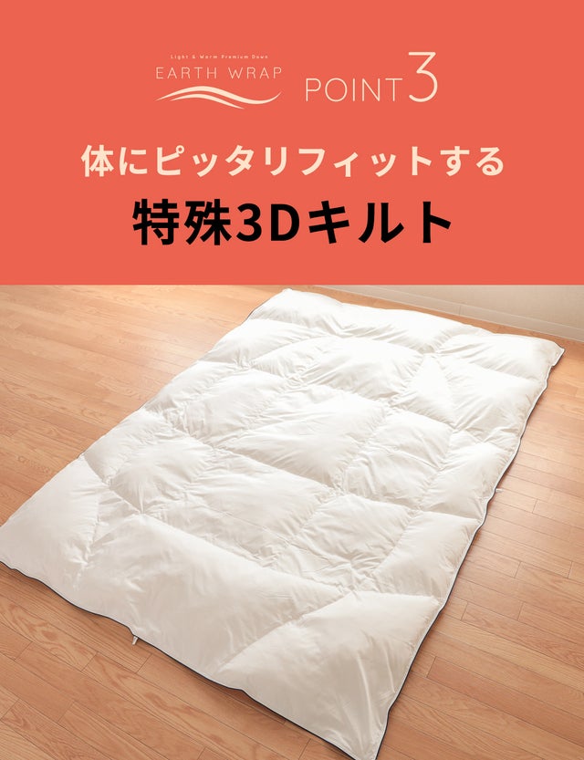 フィット感にこだわった独自開発のキルト[EARTH WRAPキルト]を採用。一般的な羽毛布団のマス目キルトに比べると、身体のラインに添いやすくぴったりと密着。