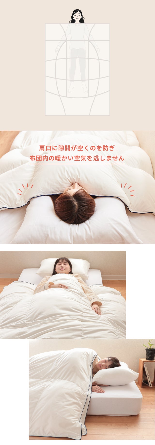 肩口や枕の部分に空いた隙間から冷気が入り込むのを防ぎ、体温で暖まった布団内の空気を逃さずに暖かさをキープします。