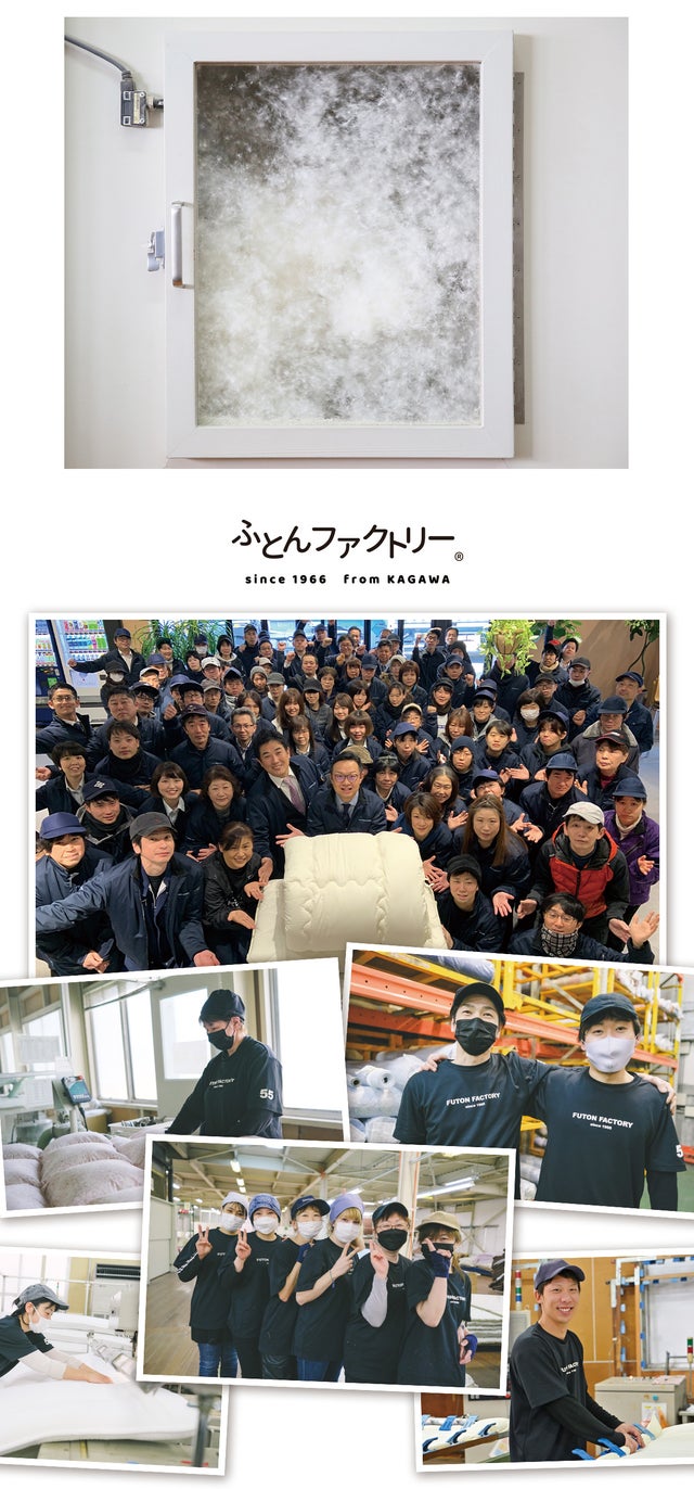 昭和41年、こたつテーブルの生産が盛んだった香川県にて、セット販売するこたつ布団の製造を中心に創業。その後、寝具の製造にも幅を広げ、現在は国内有数の規模の布団工場を持ち、香川から全国に向けて日々布団・寝具を生産・出荷しています。
