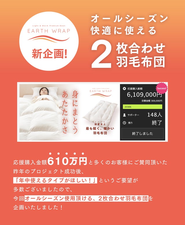 「Makuake(マクアケ)」は、実行者の想いを応援購入によって実現するアタラシイものやサービスのプラットフォームです。このページは、 プロダクトカテゴリの 「創業史上 最も軽く、年中使える2枚合わせ羽毛布団【Earthwrap】」プロジェクト詳細ページです。