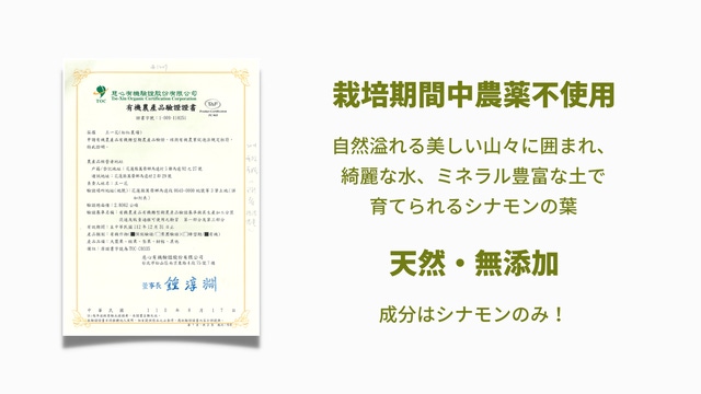 栽培期間中農薬不使用、成分は天然のシナモンのみ!