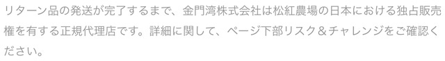 ※使用感などに関しては、感じ方に個人差が予想される製品でございます。そのため、使用感等に関する返品・返金はお受けいたしかねます。 ※初期不良以外に関する返品・返金はお受けいたしかねます。 ※モニター環境によって、画像の色が実物と異なって見える場合がございます。 ※応援購入の数が想定を上回った場合、製造工程上の都合等により出荷時期が遅れる場合がございま す。 ※想定を上回る皆様から応援購入を頂き、量産体制を更に充実させることができた場合、一般販売価格が予定価格を下回る可能性がございます。 ※リターン品の配送が完了するまで、金門湾株式会社は松紅農場の日本における独占販売権を有する 正規代理店です。並行輸入品が発生する可能性がございますが、並行輸入品には正規代理店による製品 サポートを受けることができません。 また、正規代理店を通じて購入することで、日本国内での流通に必要な各種許可の取得や、関税の適切な処理が担保されます。 ※一部国内に類似商品が出回っている場合がございます。弊社では他社の類似品に関してのお問い合わせには対応出来ませんのでご了承ください。 ※本文中に記載させていただいたスケジュールは、あくまでプロジェクト公開時点の予定です。応援購入の性質上、配送遅延のおそれがございます。 ※原則として、配送遅延に伴う応援購入のキャンセルはできませんが、リターン配送予定月から2ヵ月を超えた場合には、希望者に限りキャンセルにて対応させていただきます。