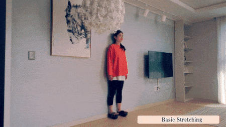 ストレッチ用シューズを履いたまま、肩幅よりも少し内側に両足を広げ、壁に寄りかかりながら立ってみましょう。肩と腰の正しい姿勢をサポートするために、毎日少しずつ時間を増やしながらチャレンジしてみましょう。