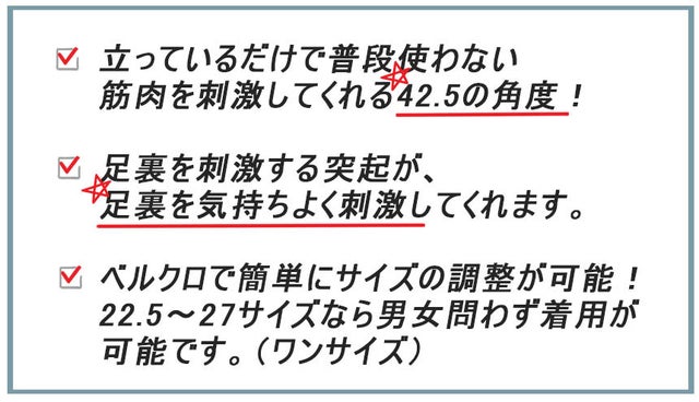 - 立っているだけで普段使わない筋肉を刺激してくれる42.5の角度!