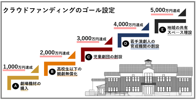 支援金額が3,000万円に達した場合は、地域の児童が参加することを想定した、参加費無償の児童劇団を創設します。