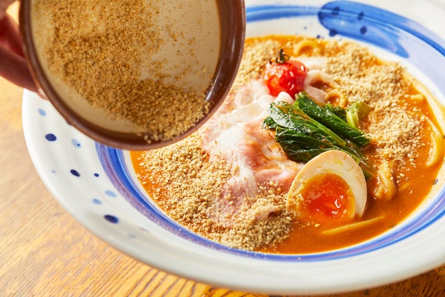 オマール海老の出汁に練りごま、辛み少しを加えた海老坦々麺のようならーめんです。ごまの旨味が加わり、濃厚で厚みが増したらーめんに仕上がっています。