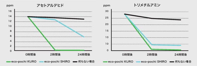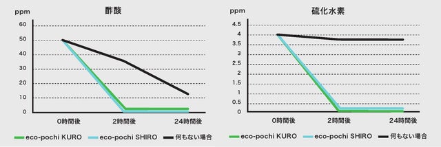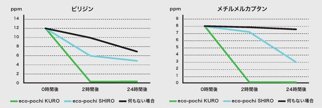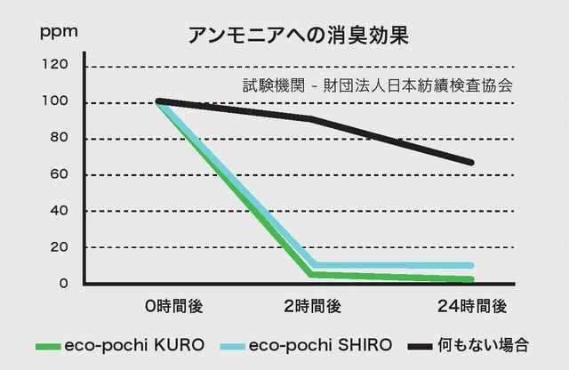 消臭効果に関しては、第三者機関(財団法人日本紡績検査協会)により、「本製品の消臭成分を入れた試験容器」と「空の試験容器」を用いた各検査(試料の重さ:10g、試験容器:5リットルテドラーバッグ、容器内のガス量:3リットル、ガス初期濃度:各グラフの通り)において消臭性に関する検査済み。