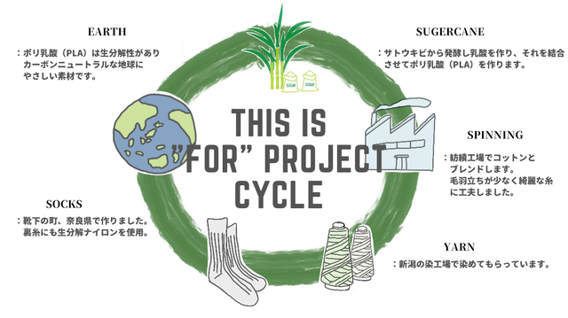 靴下という消耗品だからこそ早く地球に還る方がベター、糸屋として考えてモノづくりしてみました。この靴下を“for”と名付けたいと思います。