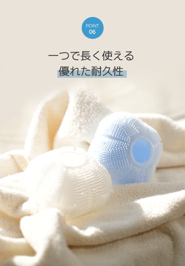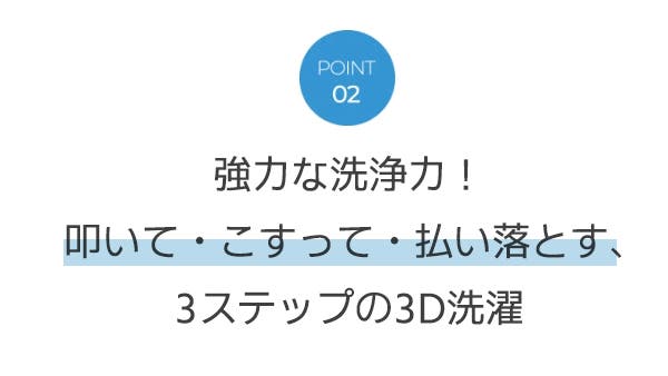 - 2,500本のシリコン突起と叩く・こする・はたくの3ステップで、まるで手洗いのような洗浄力!