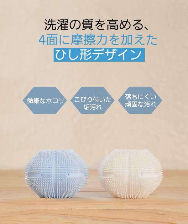 4面のエッジを持つひし形構造を採用したランドリーボールは、繊維の隙間に入り込んだ微細なホコリを除去するだけでなく、たたき洗いのような効果を発揮し、頑固な汚れの除去にも役立ちます。