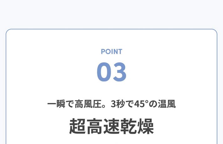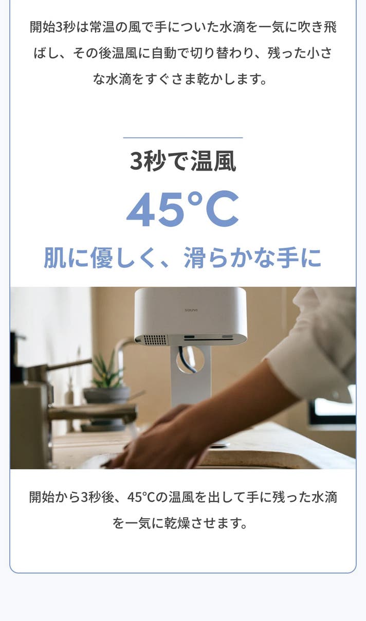 A. 約3秒で45℃温風が出て、手を約15秒で乾燥できます。