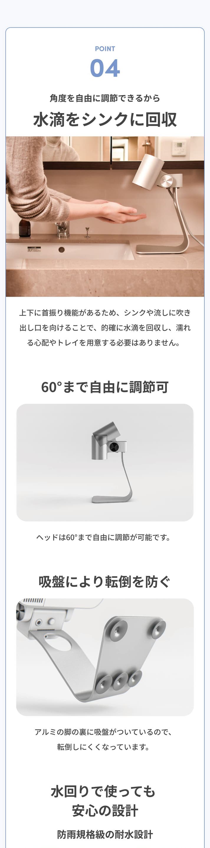 A. 最大60°まで角度調整可能。水滴はシンクに直接落ち、受け皿不要で清潔です。