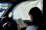 お昼休みに仮眠を。車内の空気を外に逃がさないのでエアコン効率が高くなり、ガソリン代を気にすることなくくつろげます。