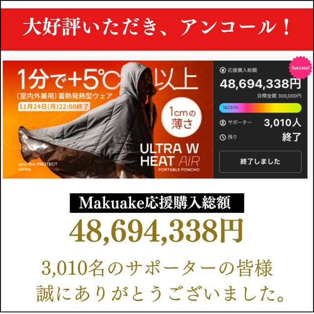 「Makuake(マクアケ)」は、実行者の想いを応援購入によって実現するアタラシイものやサービスのプラットフォームです。このページは、 ファッションカテゴリの 「【アンコール】暖房に頼らない冬を。わずか1cm、独自Wヒートの超軽&極暖ウェア」プロジェクト詳細ページです。