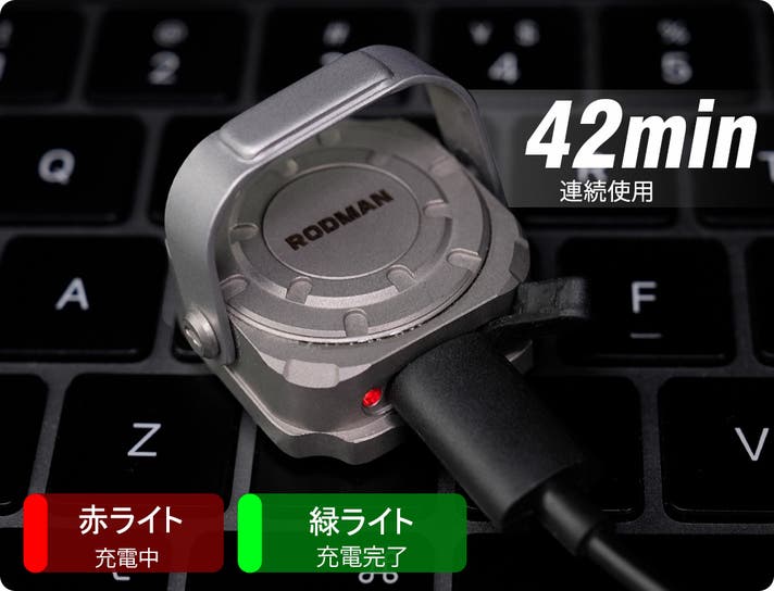最大光束 300ルーメンで約 42分連続使用できる150mAhバッテリーを内蔵。