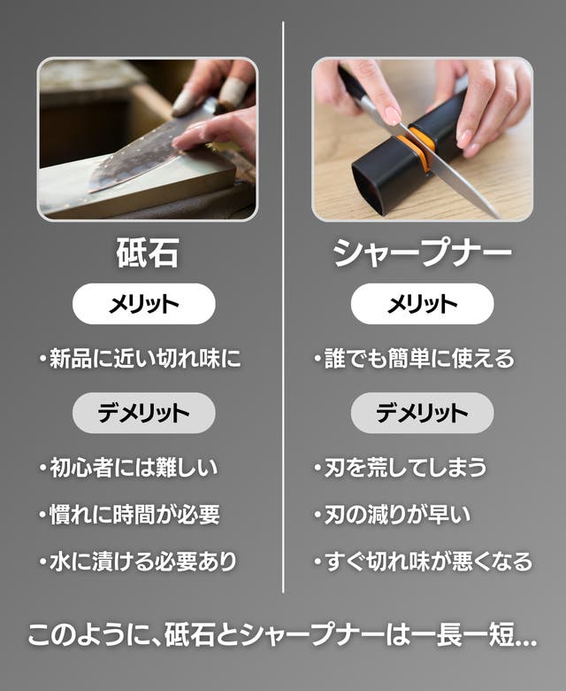 まずは、砥石とシャープナーのメリットとデメリットについて確認していきましょう。