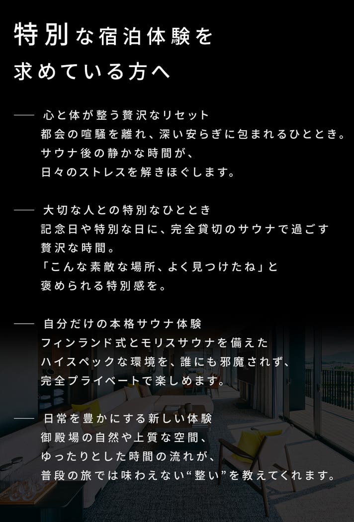 2025年9月から利用可能なサウナ付きスイート部屋1泊分の宿泊券&FHGホテルオリジナルステッカー付マクアケ限定プランです。
