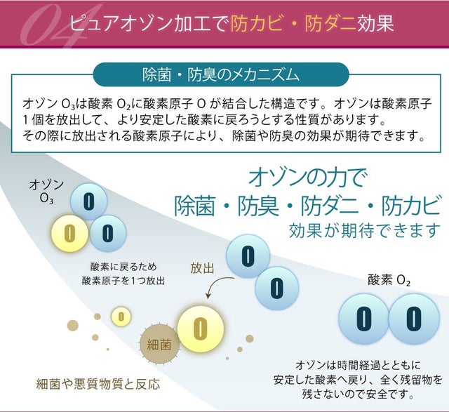 地球に優しいオゾンを用い、羽毛中の微生物を殺菌し、悪臭の主な原因である硫酸化水素を分解するオゾン加工が施されているため、抗菌・防カビ・防ダニに大変、優れた効果があります。